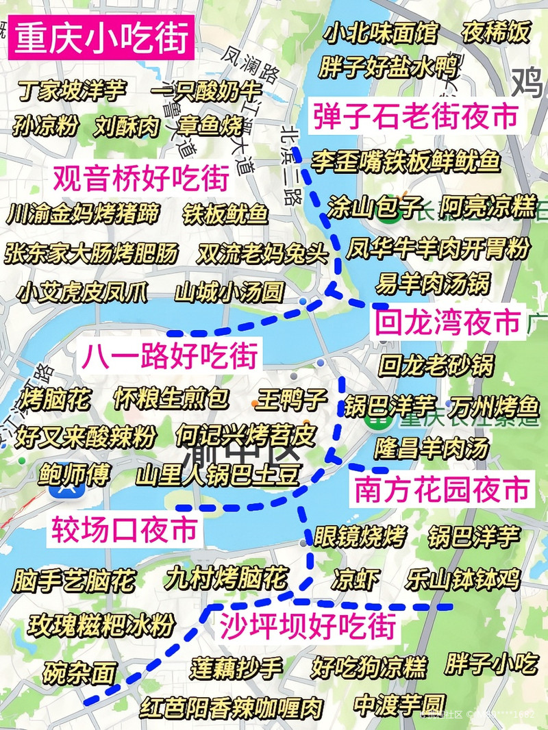 - 黄桷坪夜市(九龙坡):学生党最爱,胡记蹄花汤、梯坎豆花。